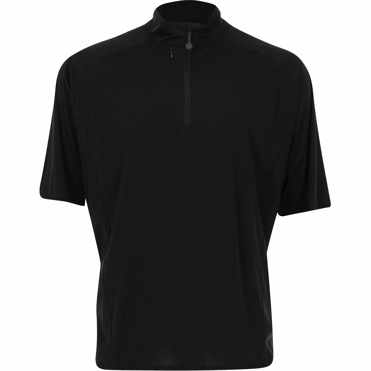 - Stand up ¼ zip through collar, hidden chest pocket, elastic hem